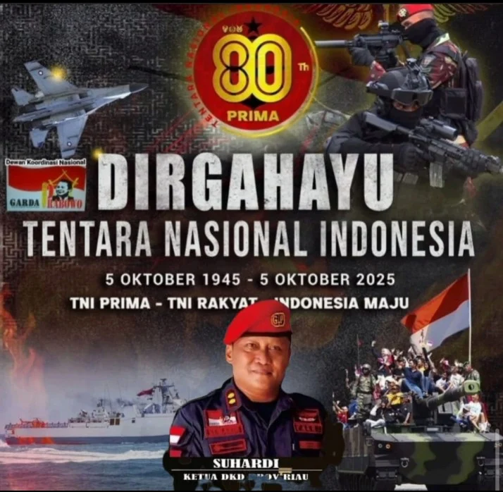 Kami dari DKD Garda Prabowo Provinsi Riau mengucapkan selamat Hari TNI ke-80. TNI adalah garda terdepan dalam menjaga persatuan, kedaulatan, dan keamanan bangsa. Jasa dan pengorbanan mereka patut kita hargai dengan terus memperkuat rasa persaudaraan dan semangat kebangsaan,” ujar Suhardi