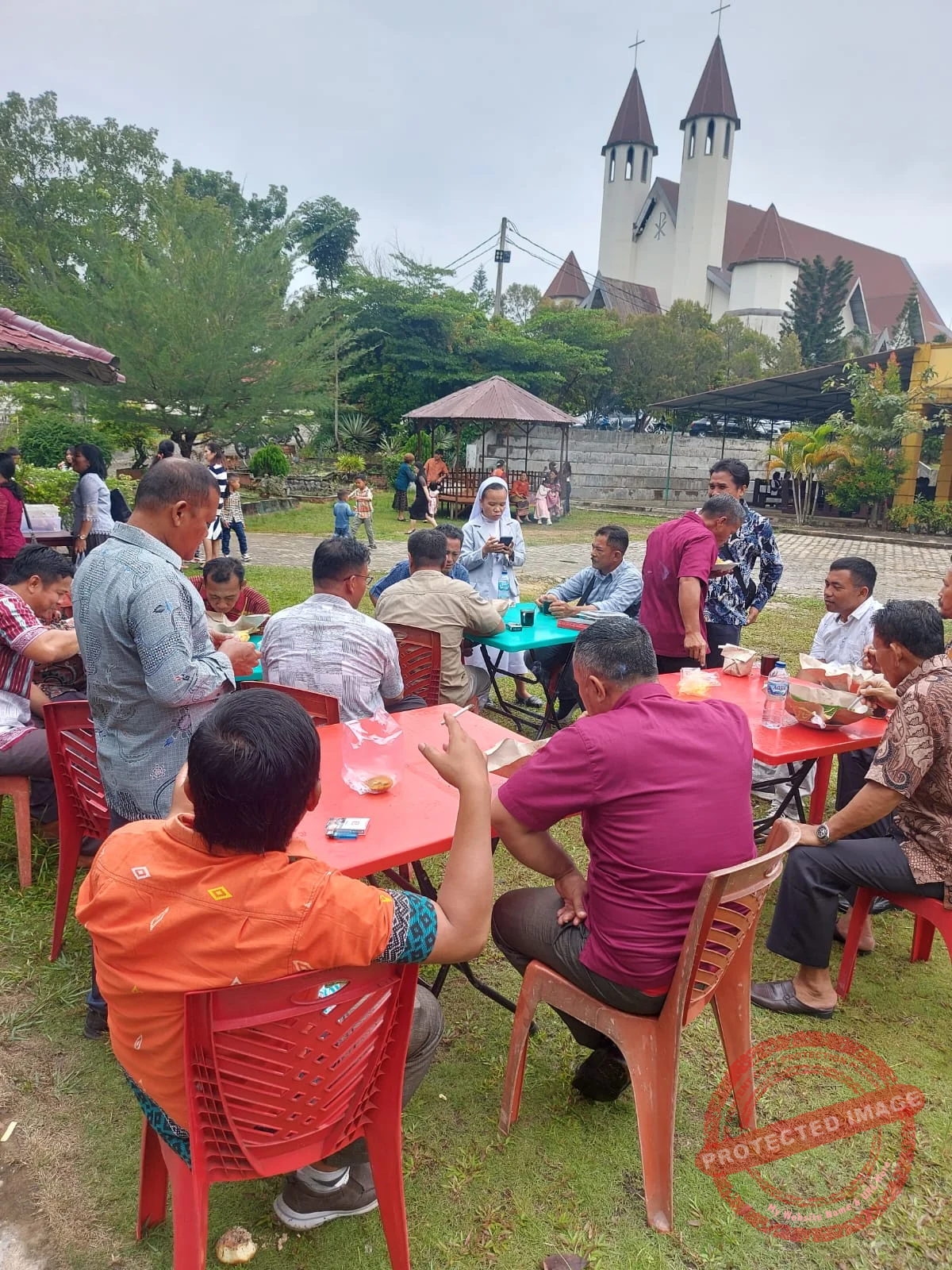 Suasana penuh kekeluargaan menyelimuti pelataran gereja di wilayah Air Molek, Kecamatan Pasir Penyu, Kabupaten Indragiri Hulu, usai pelaksanaan ibadah Misa. Komunitas KOMPAK wilayah Air Molek menggelar aksi sosial kreatif berupa santap bersama mie dan kopi hangat yang disiapkan khusus oleh panitia Paskah, Minggu (15/2).
