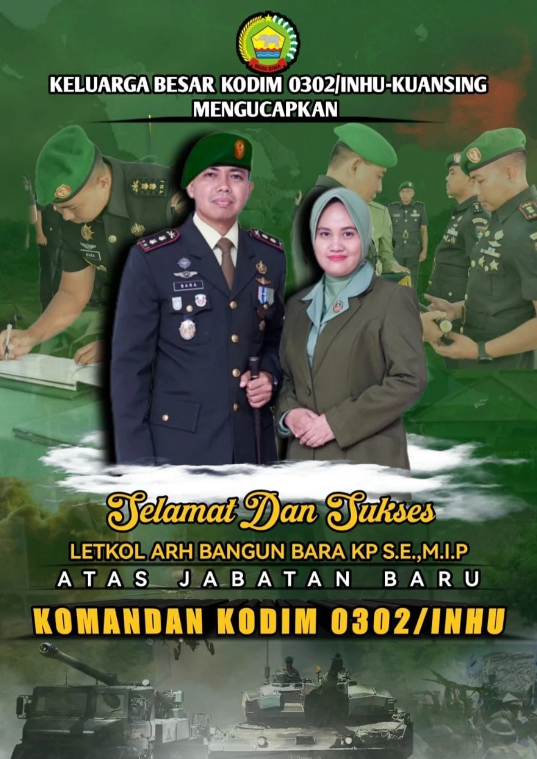> “Kami segenap keluarga besar Beserta masyarakat kecamatan peranap Inhu menyampaikan selamat dan sukses atas jabatan baru Letkol Arh Bangun Bara KP, S.E., M.I.P sebagai Dandim 0302/Inhu. Semoga selalu diberikan keberkahan, kesehatan, dan kesuksesan dalam mengemban amanah serta membawa kemajuan bagi masyarakat Indragiri Hulu,” ujar Eyi