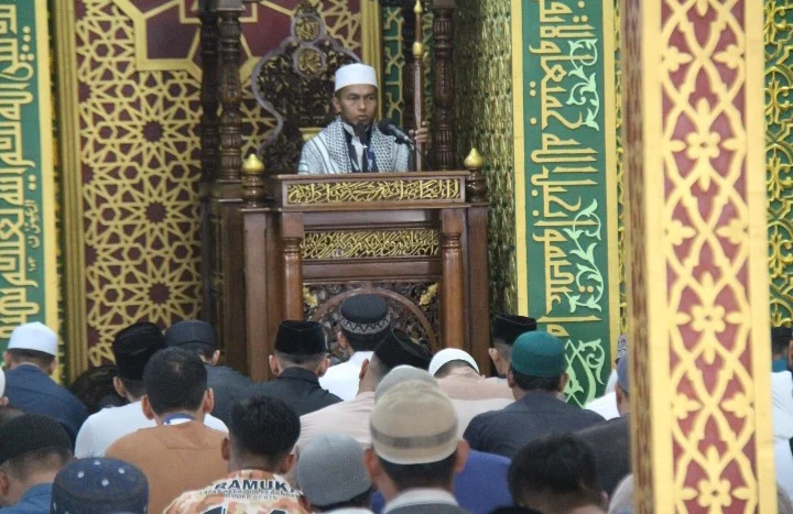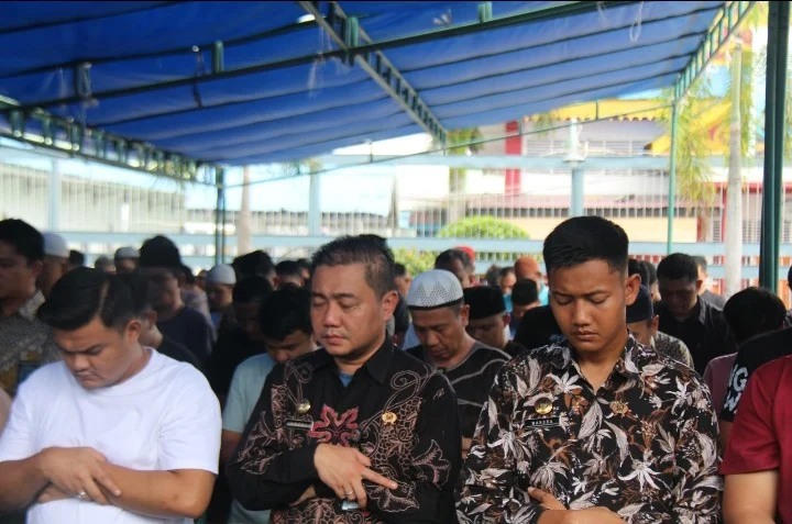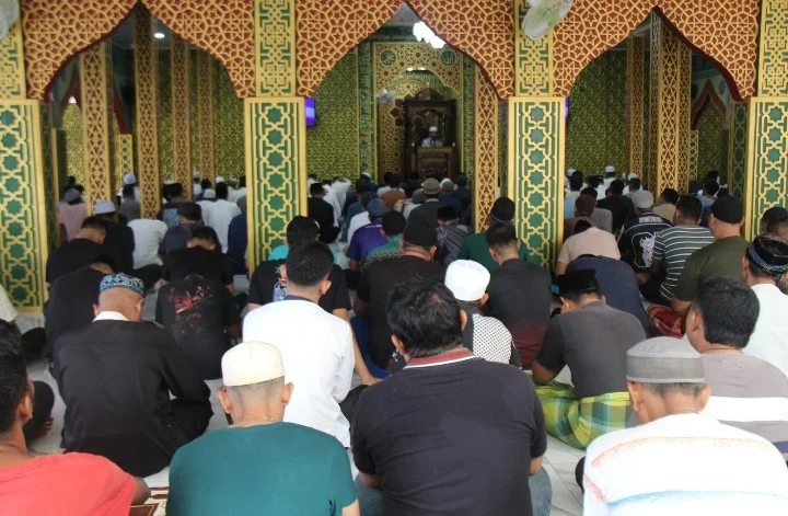 Suasana khusyuk menyelimuti Masjid At-Taubah Lembaga Pemasyarakatan (Lapas) Kelas IIA Pekanbaru. Ratusan Warga Binaan Pemasyarakatan (WBP) melaksanakan ibadah sholat Jumat berjamaah bersama Kepala Lapas Pekanbaru, Yuniarto, dan jajaran petugas Lapas Pekanbaru, Jumat (10/10/2025).